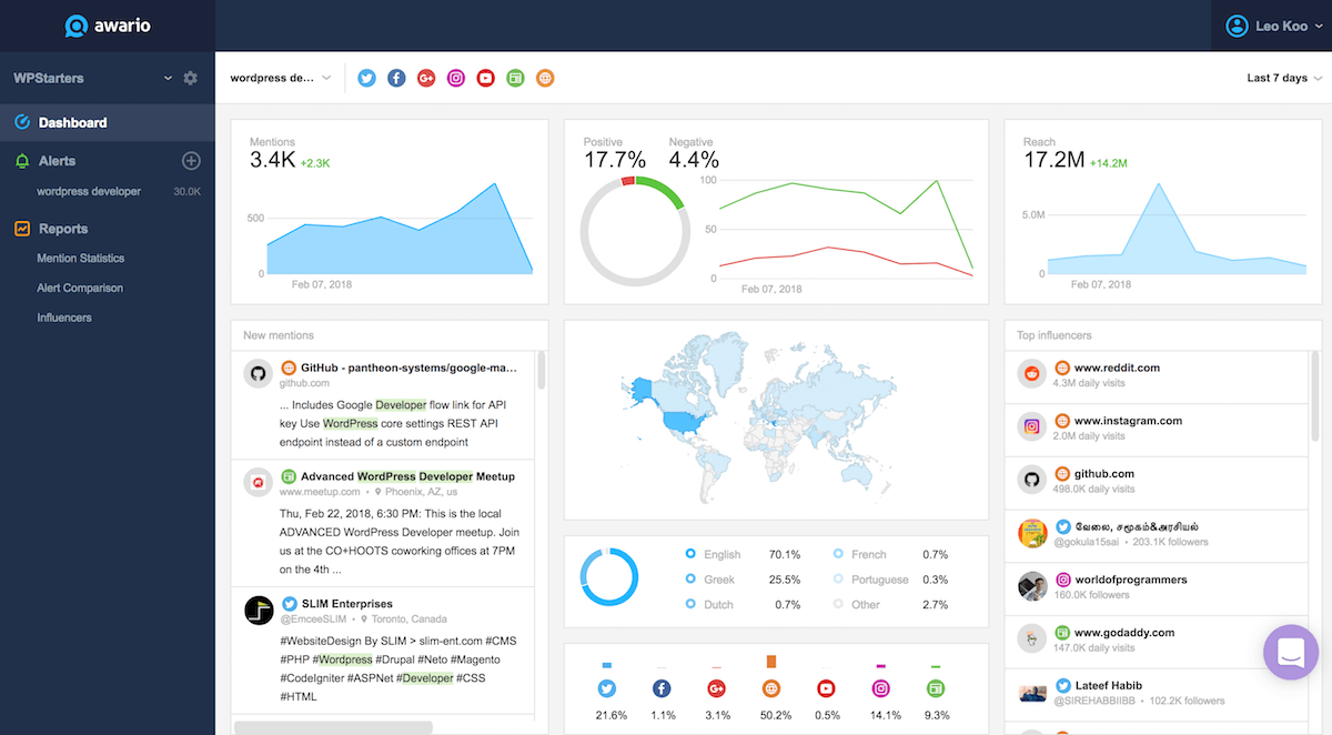 In my daily work, I use Awario to find mentions of my products as well as mentions I’m interested in. Like ‘Web Developer’ or ‘WordPress’.
