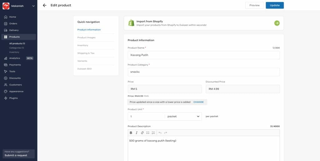 Product variations will ensure that you can sell different sizes, shapes and colors of the same product without creating several products with the same description. This makes it easy for you to manage your orders while helping your website’s SEO. I’m happy that product variations are part of Dukaan, as there were many older online stores that lacked variable products.