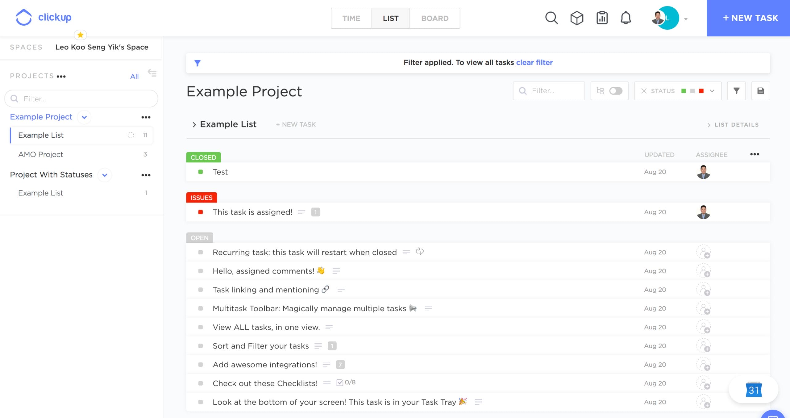 ClickUp’s project management comes across as a list of items with tasks and subtasks that we could assign various statuses to, other than the default Open and Closed status.