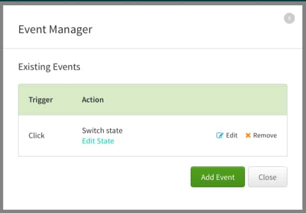 We also love the fact that we could create multiple buttons and then configure the reaction to these buttons. Reactions is called as “events” under Thrive Leads and via an event manager, you can either switch the state of the lightbox (or pop up to some of you), close the lightbox or even trigger some fancy animation.